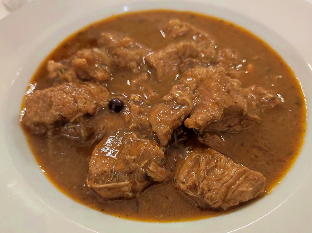 Elkészítés: A zsírt felforrósítjuk a bográcsban, majd hozzáadjuk a kb. 2 centis kockákra vágott húst, és erősen lepirítjuk. Hozzáadjuk a finomra vágott vörös- és fokhagymát, majd mehet a bográcsba az apró kockákra vágott paprika és paradicsom is. Hozzáadjuk a paprika-krémet, a szegfűszeget, a babérlevelet, a borókabogyót, a fűszerpaprikát, alaposan átkeverjük, és hozzáadjuk a rozmaringot és a kakukkfüvet is. Felöntjük a vörösbor felével, majd ha elpárolgott az alkohol nagyja, felöntjük annyi vízzel, ami kb. 1 ujjnyira ellepi a húst. Amikor felforr, sózzuk, borsozzuk, és időnként megkeverve és a vizet pótolva addig főzzük, amíg a hús meg nem puhul.