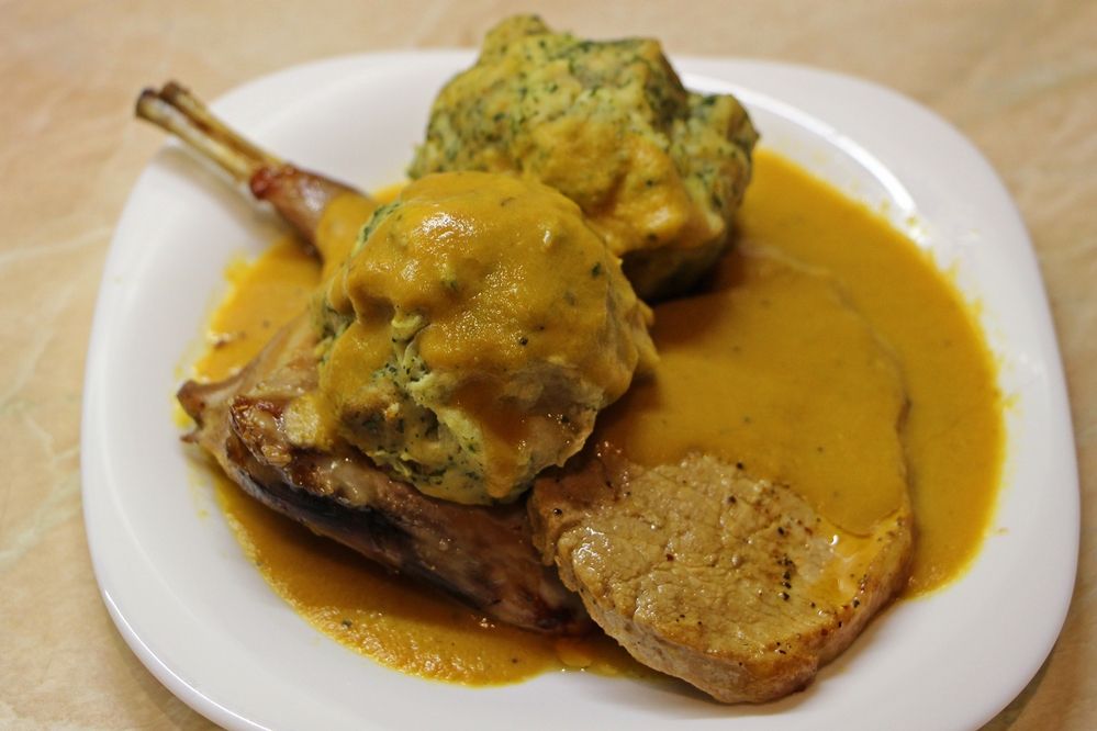 Elkészítés: A mártáshoz a hozzávalókat apróra kockázzuk. Egy edényben a cukrot megolvasztjuk, beledobjuk a nagyon apróra vágott hagymát, az olajat, majd a zöldségeket. 5 percig forgatjuk, és felöntjük annyi vízzel, hogy ellepje. Beletesszük a többi alkotórészt is. Addig főzzük, míg a répa és a zeller teljesen megpuhul. Ekkor botmixerrel krémesre turmixoljuk. Két deci tejfölből és 3 kanál lisztből habarást készítünk, s beleöntjük. 10 percet főzzük fedő alatt. Az előkészített nyúlcombokat borban, kevés sóval puhára főzzük, amíg a lé szinte lefő róla. 4 combhoz 1 üveg chardonnay-t nyugodtan elhasználhatunk. A szeletelt karajt kissé klopfoljuk, majd sóval, borssal 2-2 percig oldalanként kisütjük. A zsemlegombóchoz egy félkilós kenyeret felkockázunk, majd sütőben, 160 fokon, 15 perc alatt megpirítjuk. Mikor kihűlt, hozzáadunk 2 kiskanál petrezselyemzöldet, 1 finomra kockázott hagymát, 1 ek sót, 5 tojást. Összekavarjuk, majd hozzáadunk annyi lisztet, amennyitől összeáll. Forrásban levő vízbe adagoljuk, nedves kézzel formálva a gombócokat. 15 percig főzzük, kivesszük, és lehet tálalni.