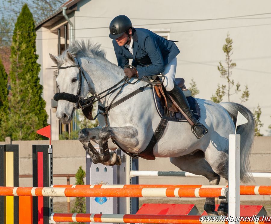A bábolnai megméretés másik vasárnapi, felnőtt Grand Pix-jében két halasi lovas is érdekelt volt. Közülük Füzér Gábor (címképen, Kiskunhalasi LTSE) hibátlan lovaglással jutott be az összevetésbe Je T'aime nevű lovával. A döntő fordulóban aztán egy verőhibát vétettek, így a negyedik helyen zárt a kettős. Fazekas István (Határör Dózsa SE) első számú lovával, Walterral az alappályán kétszer vert akadályt, ők a tizenegyedik helyen fejezték be a GP-t.