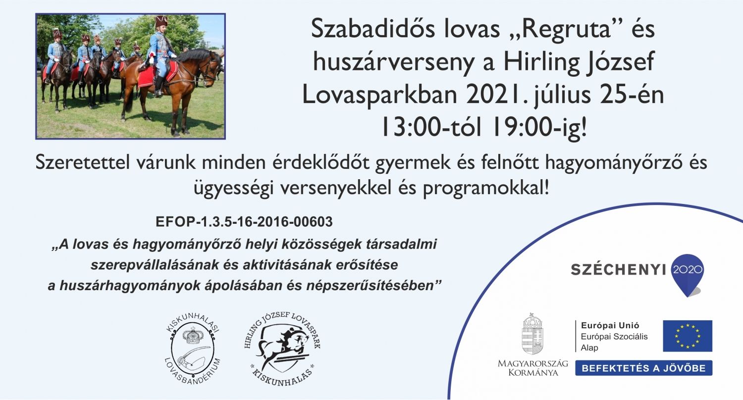 Július 25-én vasárnap szabadidős lovas regruta és huszárverseny kerül megrendezésre a Hirling József Lovasparkban. Délután 13 órától rednezik a gyermek és póni versenyszámokat, továbbá a championatus I. forduló döntőit, ahol kiskunhalasi sportolókért is szurkolhatnak majd a helyiek. A rendező Kiskunhalasi Lovasbandérium Egyesület minden kedves látogatót sok szeretettel vár a rendezvényre, a belépés ingyenes. (X)