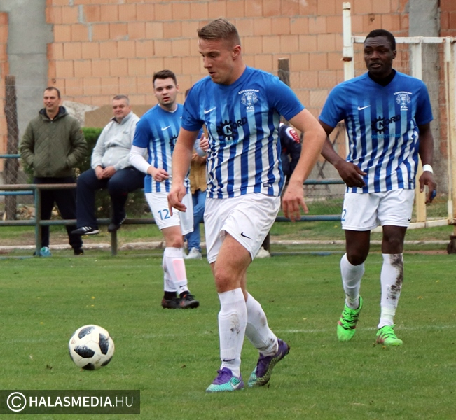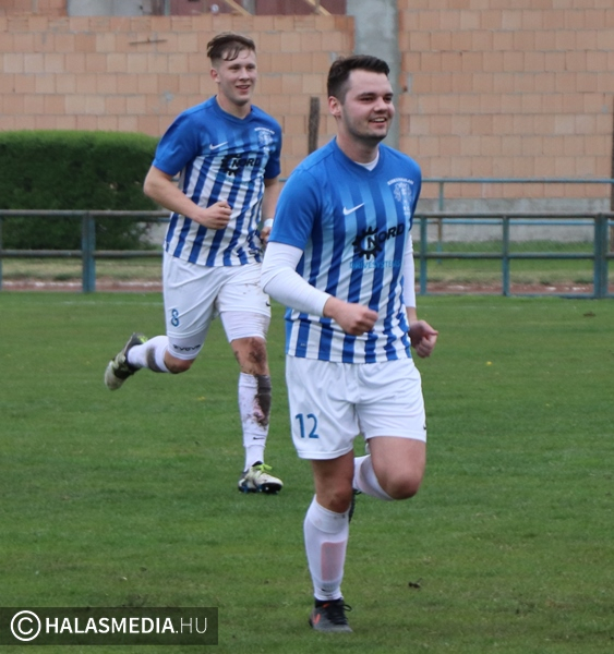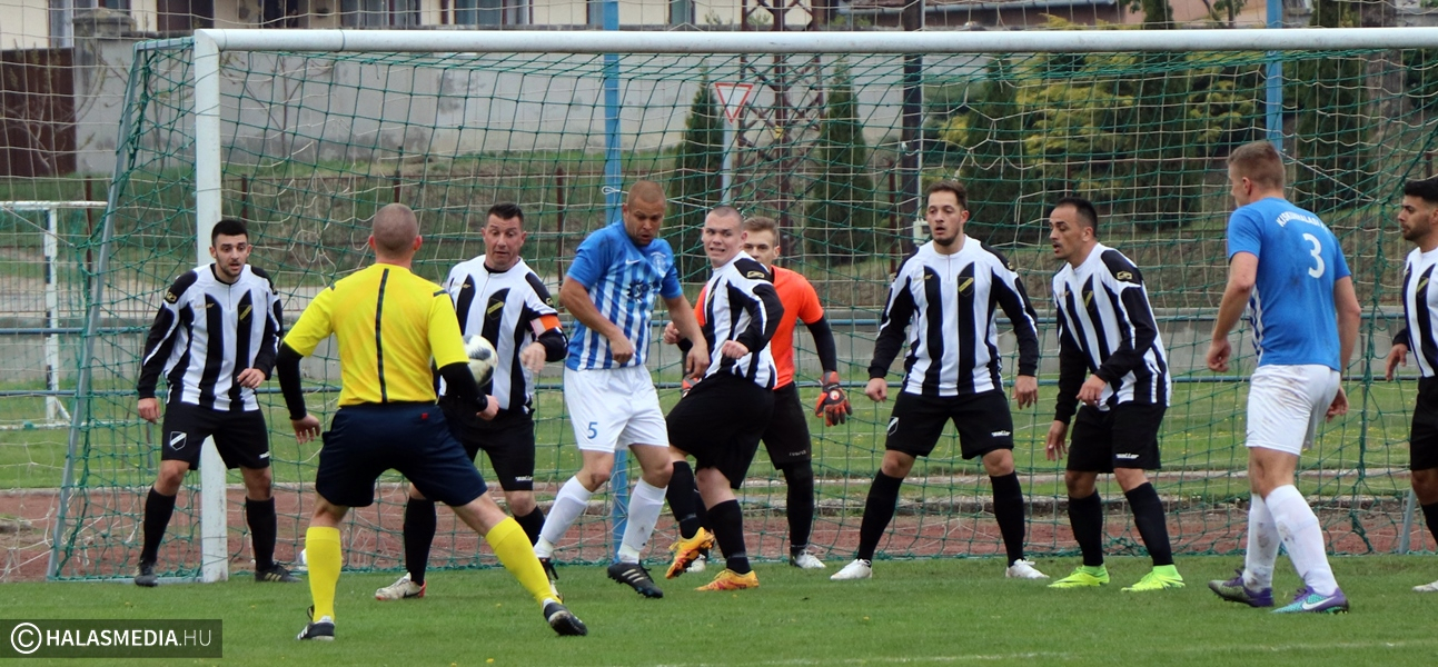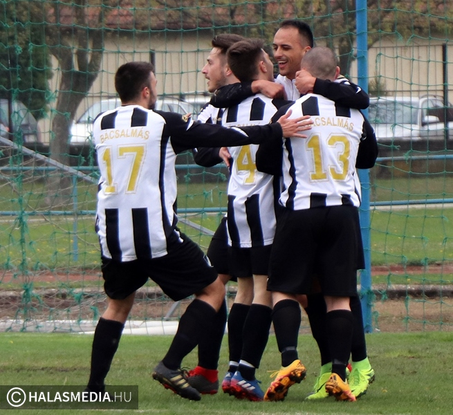 A halasiak jól kezdték a mérkőzést, de a bácsalmásiak is veszélyeztettek, főként a bal oldalon volt sebezhető a hazai védelem. Egy hibát góllal büntetett az ellenfél, a 11. percben egy remek beadás után Vuckovic Dániel mutatós fejessel szerezte meg a vezetést a vendégeknek. A hazaiak rövid időn belül talpra tudtak állni, a 19. percben a születésnapos Ács Gergely előreívelését Sorin fejelte a hálóba. Ez is szépségdíjas találat volt. A szurkolók még az egyenlítésről beszéltek, amikor újra közepet kezdhetett a Bácsalmás. Tóth Tamás távoli lövése szemmel láthatóan meglepte Koncsok Ervint, aki suta mozdulattal nyúlt a labdáért, amely így a kapuban kötött ki. Megzavarodott a vendégcsapat ennek egy perccel később újabb gól lett az eredménye, ezúttal Mihalkó Máté volt eredményes. A szünetig nem változott az eredmény.