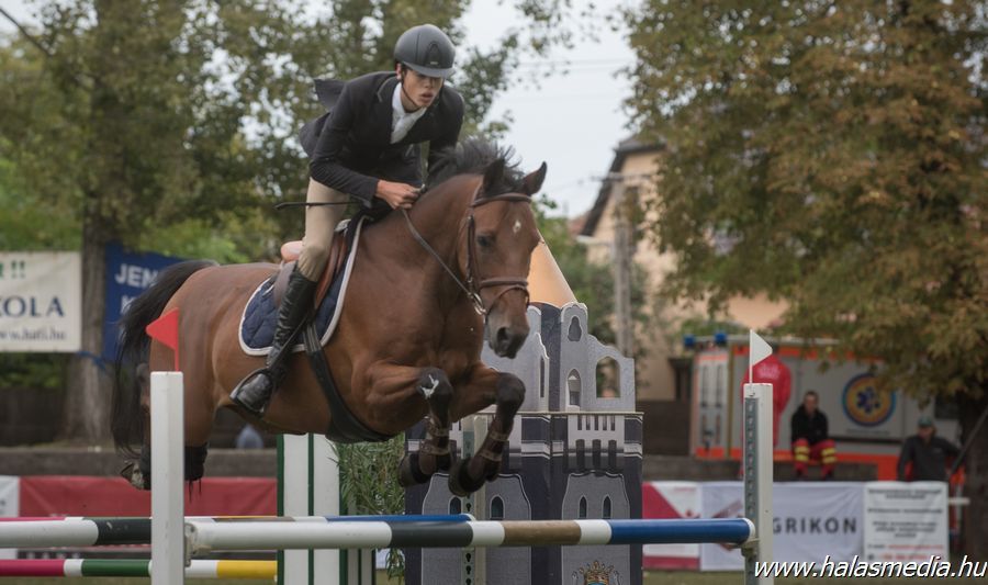 A délután kezdődő fiatal lovas elődöntőben sok szép pályát látott a közönség. Közülük az utolsó előttiként, második lovával, Clintus-szal startoló Hollé Sára (Hévíz Sportkör) emelkedett ki. Nyugodtan, de jó iramban, tereket nyerő fordulókkal teljesítette 10 éves szürke ménjével a feladatokat és győzött. „A négyes számú akadálykombináció első eleme okozott némi gondot, de Clintus megoldotta, egyébként nem volt probléma a pályán. A vízzel (vizes árok szerk.) sincs bajunk. A füves pálya most az esőzés miatt kicsit talán fogósabb, de ez igazából nem gátolt. Szeretek Halason versenyezni.” A teljes eredménylistához katt ide.