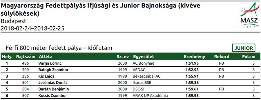 Február 24-25-én, a Budapest Olimpiai Központ (BOK) szolgált versenyhelyszínül Magyarország Fedettpályás Ifjúsági és Junior Bajnokságának. Vasárnap egy kiskunhalasi versenyzőért is szoríthattak a helyi atléta barátok. Ezúttal 800 méteren próbálta ki magát Jerémiás Donát (Ikarus BSE), aki a juniorok között a dobogóról éppen lemaradva végzett a negyedik helyen.