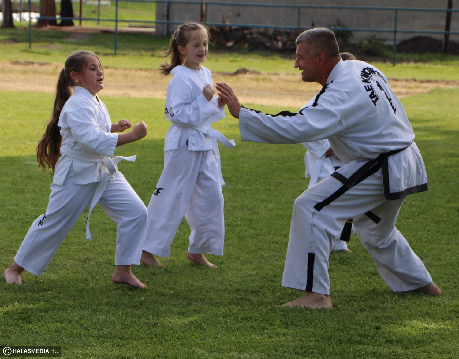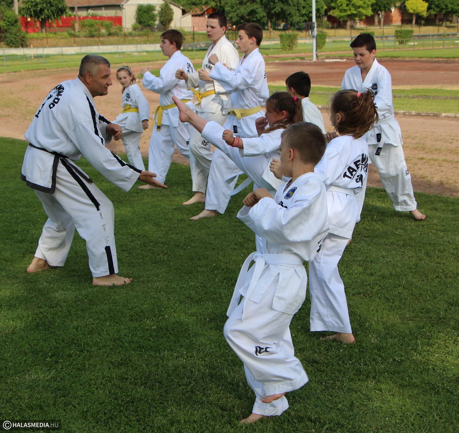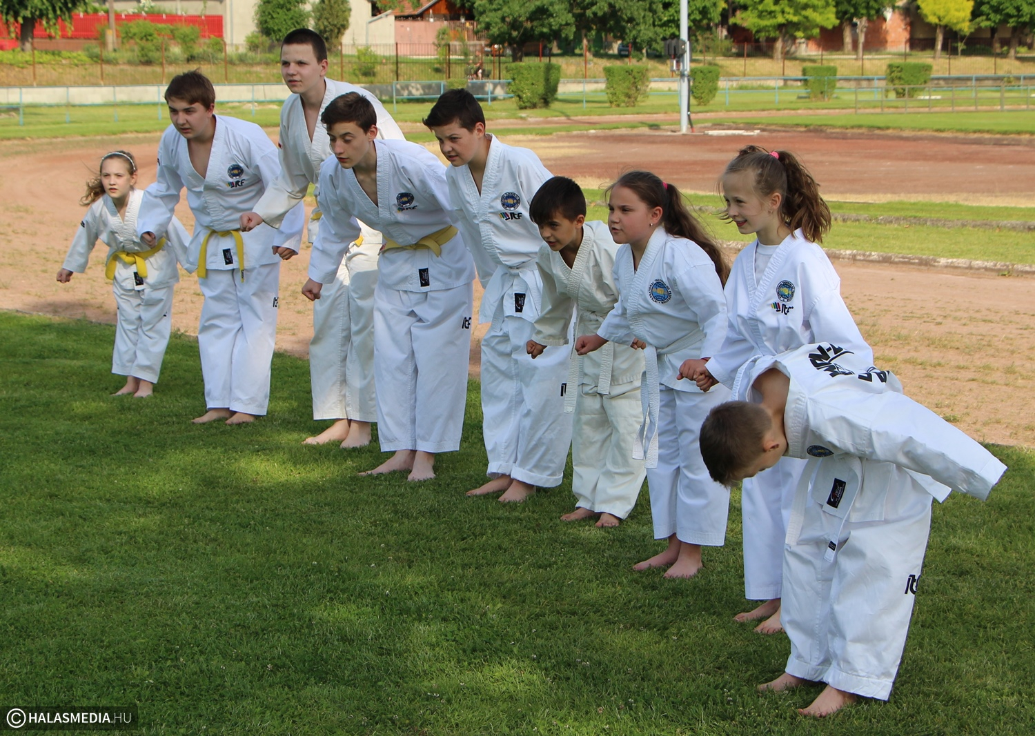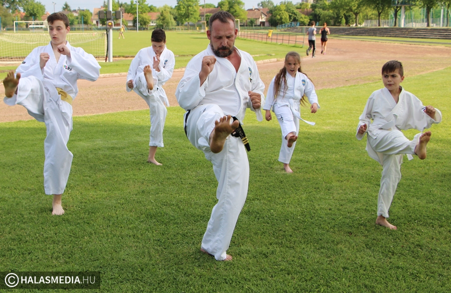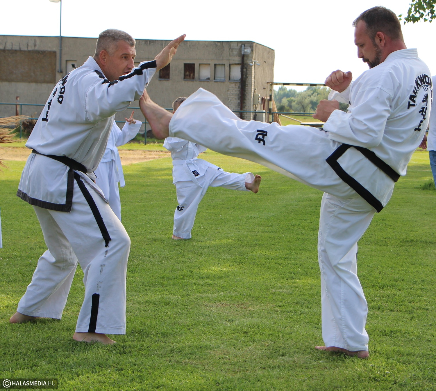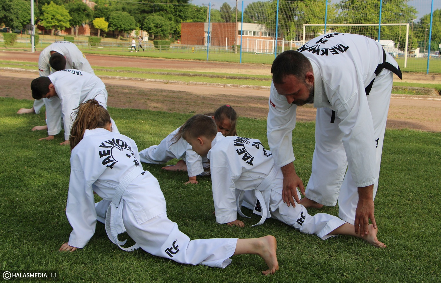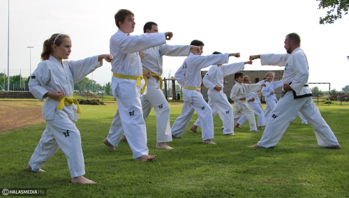Madarász Attila 4 danos mester és segítője, Pilhoffer Csaba gardírozza a Sasok SE Kiskunhalas taekwond-do egyesület fiataljait. A gyökerek még a kilencvenes évekig nyúlnak vissza, városunkban akkor kezdődött ennek a harcművészetnek a térhódítása. A jó idő beköszöntével a Bundzsák Dezső Sportközpontban gyakorolnak, ott zajlanak az edzések. Ottjártunk idején is nagyon kemény munkát végeztek a lányok és a fiúk, akik mint megtudtuk, erős közösséget alkotnak. Komoly motivációt jelentett az, hogy mindenki sikerrel vette az övvizsga jelentette akadályt, sőt volt olyan, aki kettős előléptetést kapott.