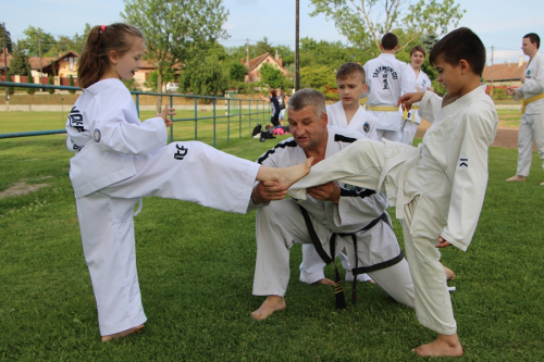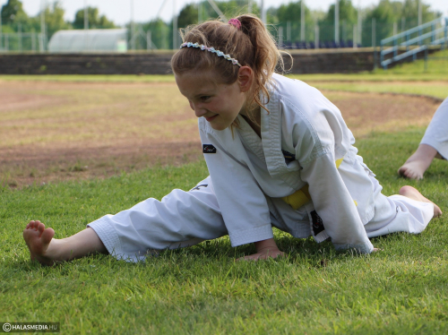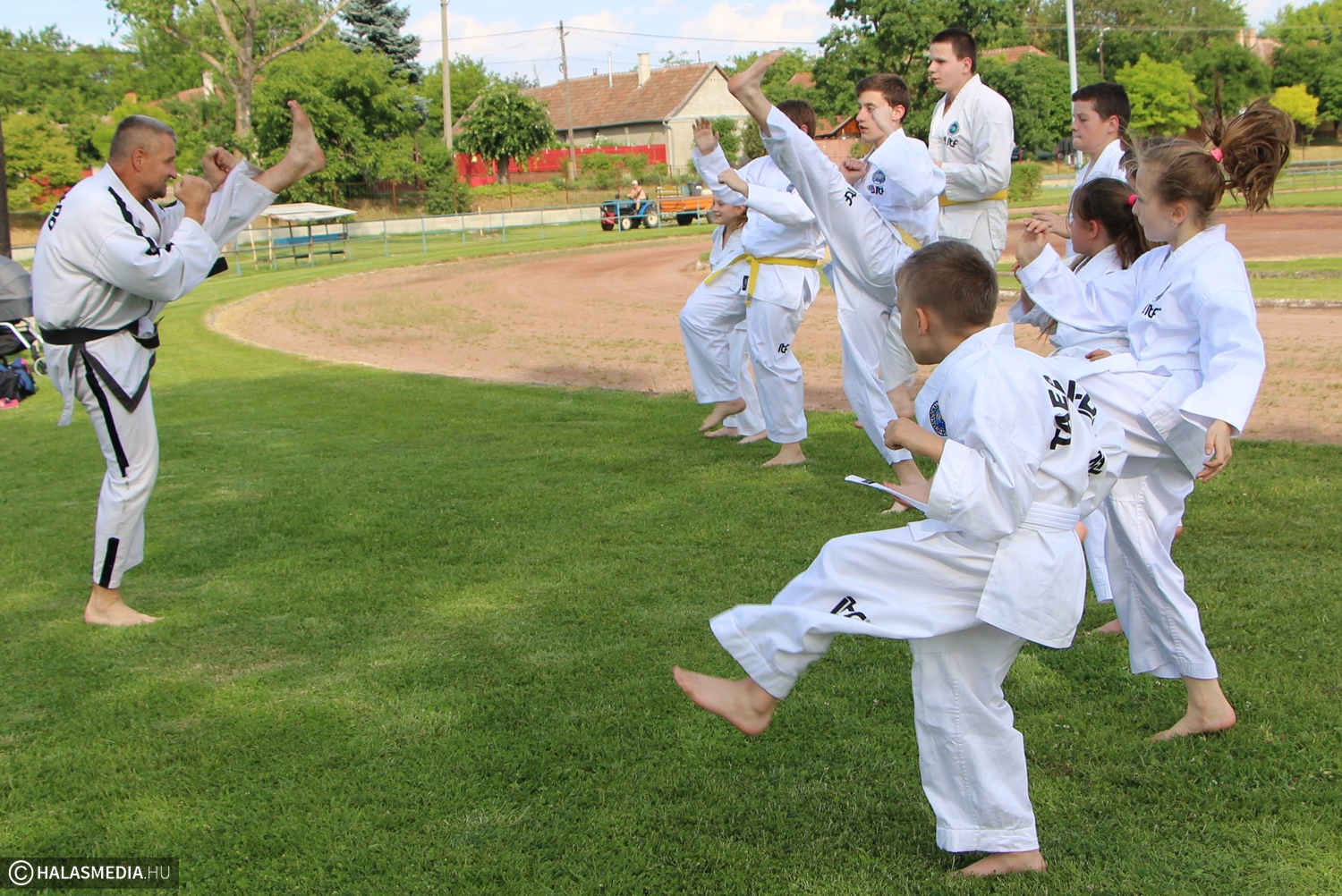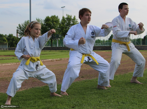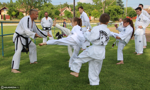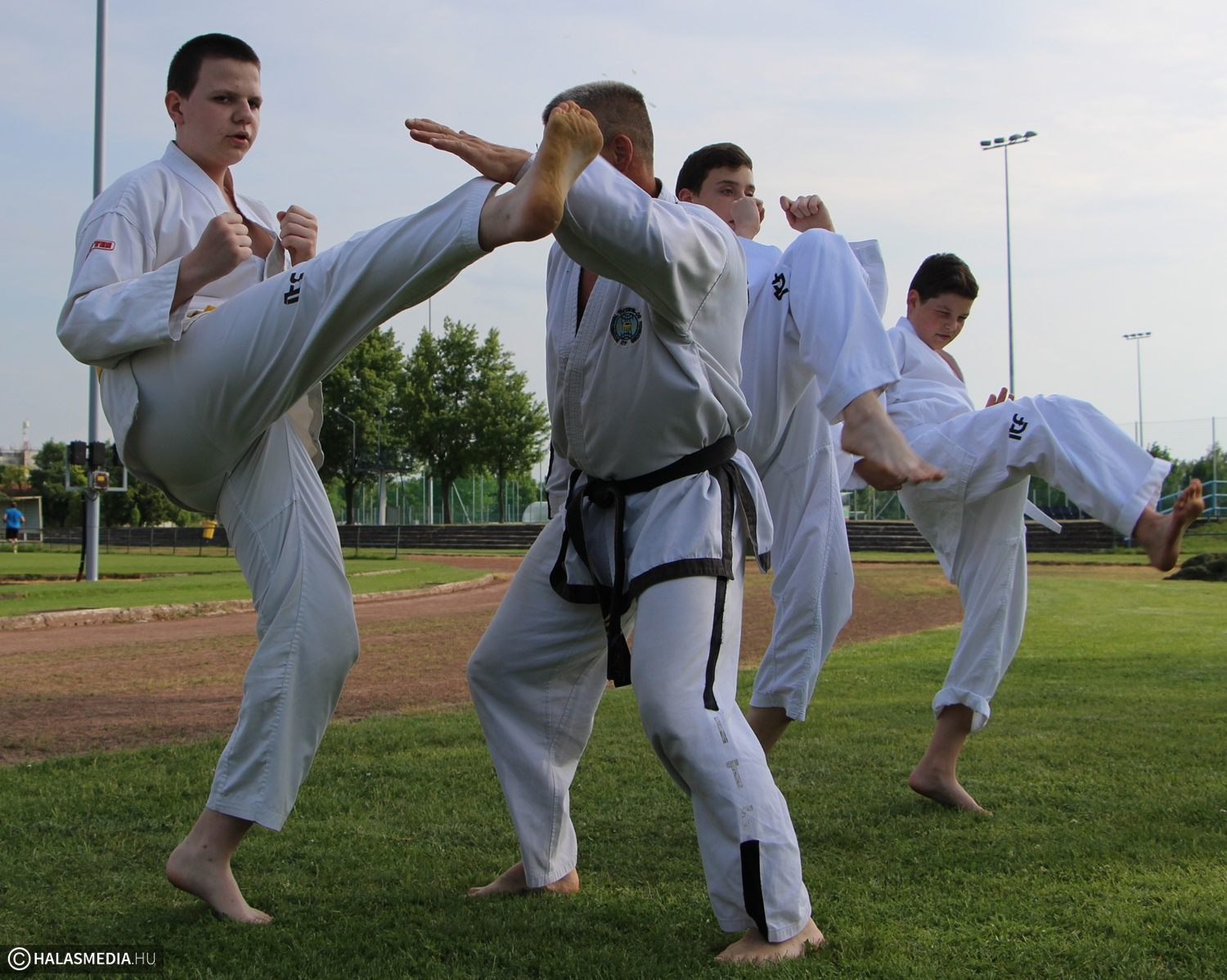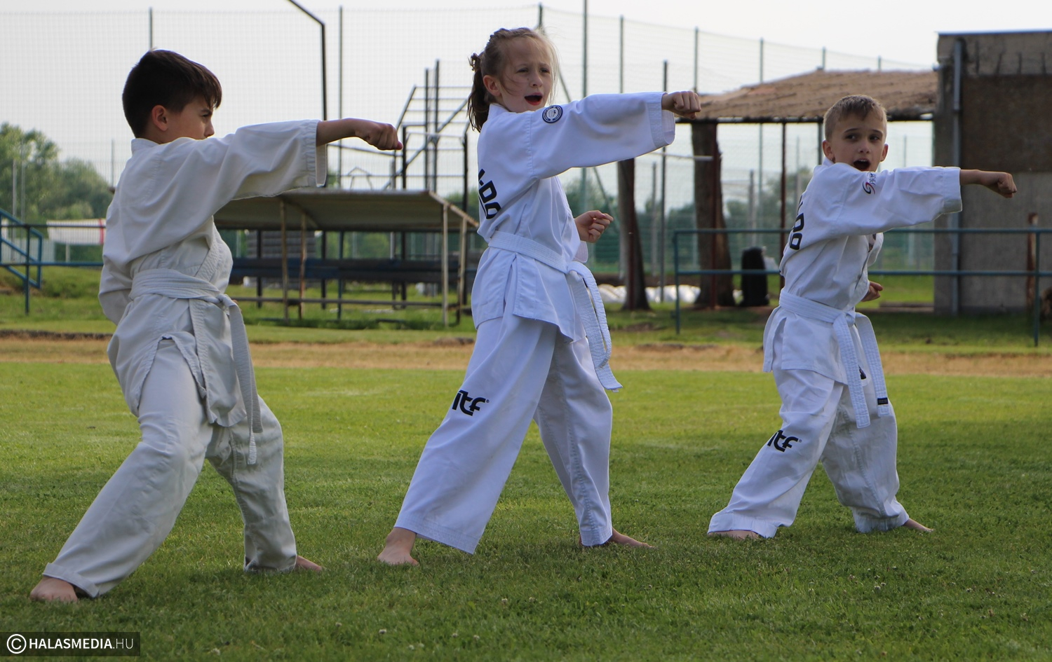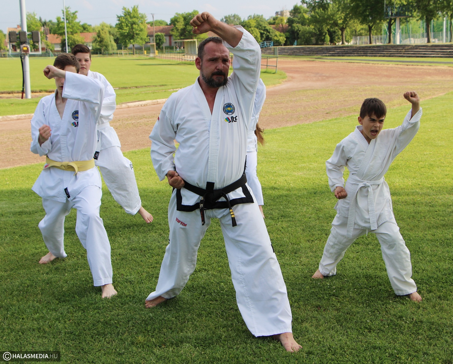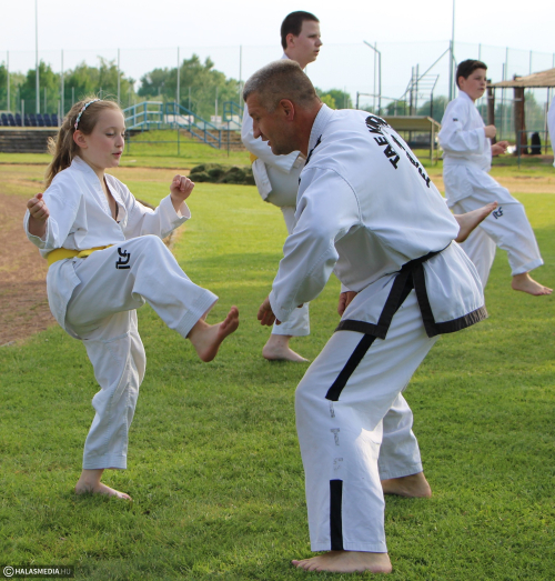 Madarász Attila 4 danos mester és segítője, Pilhoffer Csaba gardírozza a Sasok SE Kiskunhalas taekwond-do egyesület fiataljait. A gyökerek még a kilencvenes évekig nyúlnak vissza, városunkban akkor kezdődött ennek a harcművészetnek a térhódítása. A jó idő beköszöntével a Bundzsák Dezső Sportközpontban gyakorolnak, ott zajlanak az edzések. Ottjártunk idején is nagyon kemény munkát végeztek a lányok és a fiúk, akik mint megtudtuk, erős közösséget alkotnak. Komoly motivációt jelentett az, hogy mindenki sikerrel vette az övvizsga jelentette akadályt, sőt volt olyan, aki kettős előléptetést kapott.