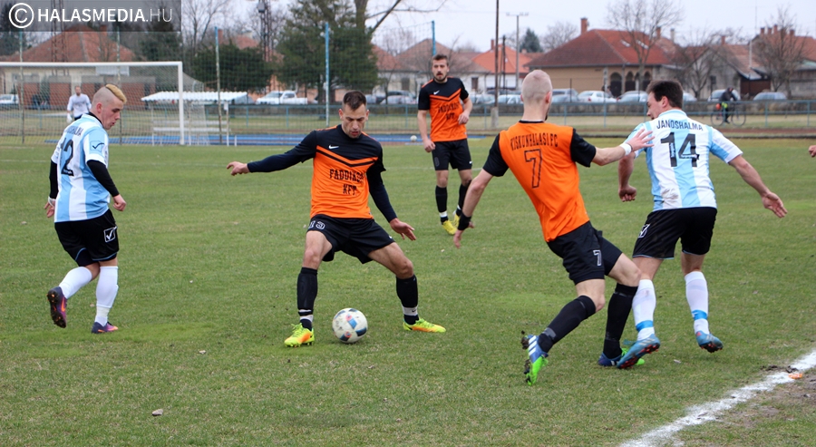 Megyei rangadót nyert a Faddikorr-Kiskunhalasi FC a Bundzsák Dezső Sportközpontban szombaton délután. A Jánoshalma vendégjátéka kapcsán az volt a kérdés, hogy a halasiak tudják-e folytatni a tavaszi jó sorozatot, amely győzelmekben mutatkozott be. Marinko Stetakovic játékosainak dolgát az első félidő hajrájáig megnehezítették a vendégek, ám ekkor egy szabálytalanság, egy bíróra tett megjegyzés és egy értékesített tizenegyes mindent eldöntött.
