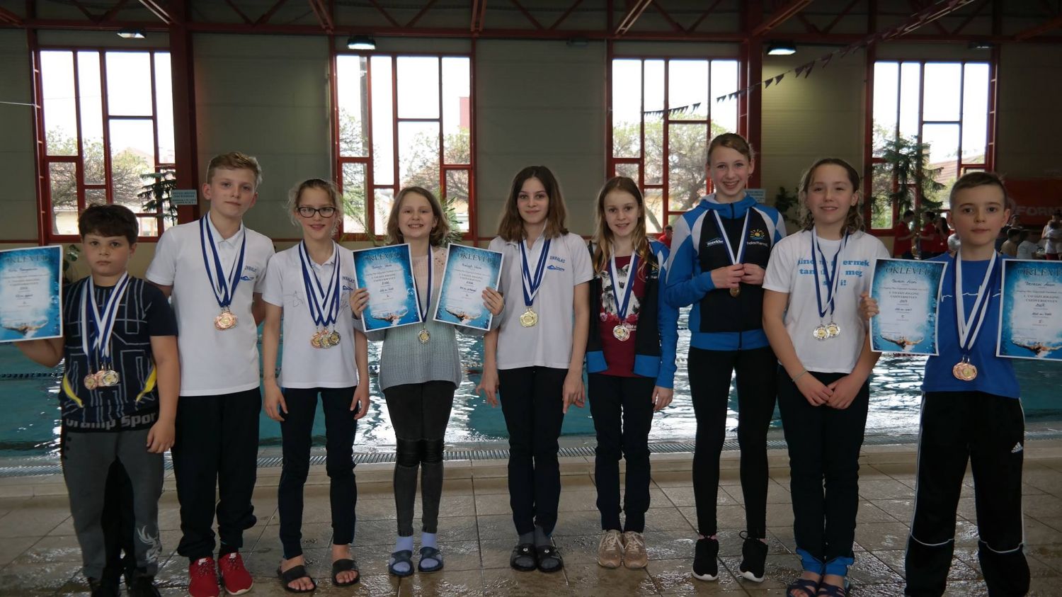 A kicsik nagy formában versenyeztek, Kiss Virág, Király Anna, Miklósi Fanni, Flaisz Fanni, Christ Izabella, Bakró-Nagy Dániel és László Dávid 31 dobogós és 8 pontszerző helyet szereztek. Ami még fontos, Bereczi Áron és Tóth Benjamin sikeres minimumvizsgát tett mind a négy úszásnemből, és életük első megméretésén érmeket szereztek. A minicsapat a házigazda mögött a 2. helyen végzett az összesítésben, amelyért kupát kapott (címképünkön). A halasiak összesen 12 arany-, 10 ezüst- és 9 bronzéremmel, valamint 8 pontszerző helyezéssel utazhattak haza. A húsvéti ünnepek után szerdától már az országos bajnokságon szerepel Juhász Adél, Juhász Janka, Szilvási Gréta és Vass Luca.