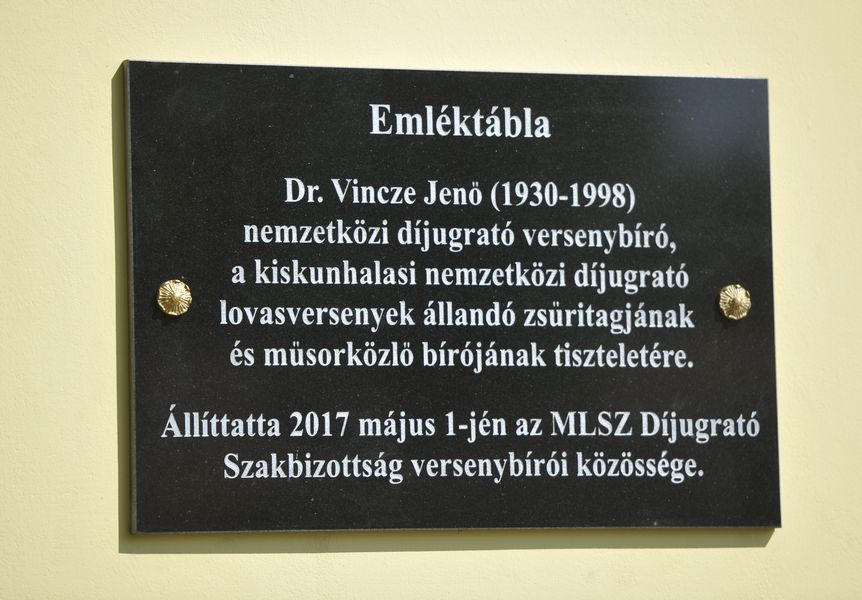 Megható ünnepség keretében emlékeztek a Halasi Lovasok és Lovak napja alkalmából koradélután a lovasbarátok a zsűri toronynál. Fülöp Róbert polgármester köszöntötte a jelenlévőket és leleplezte Juhász Tiborral a Magyar Lovassport Szövetség elnökségi tagjával, a dr. Vincze Jenő emléktáblát, majd a polgármester átadta a város által adományozott gránit táblát, amely a kiskunhalasi nagydíj győztesek nevét tartalmazza. Részletek ide kattintva!