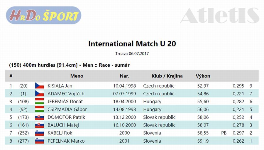 Felnőtt gátakon, eggyel magasabb korosztályban versenyzett július 6-án Jerémiás Donát magyar válogatottként egy szlovákiai nemzetközi atlétikai versenyen. Az Ikarus BSE atlétája remekül helytállt az idősebbek között. Futamában a második helyen ért célba 55,60 másodperces idővel, ami az összesítésben a bronzérmet jelentette a Szilády Áron Református Gimnázium tanulójának.