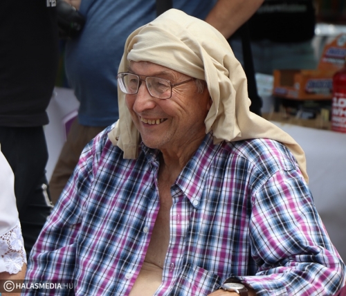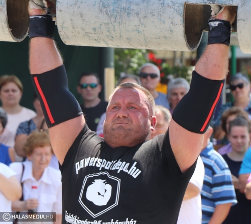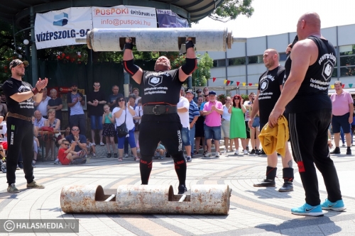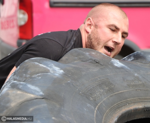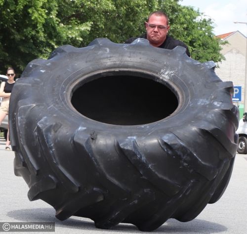A többi négy szám már a főtér rekkenő hőségében zajlott. A második verseny a rönknyomás volt, itt a nevezők különböző súlyú eszközöket igyekeztek minél többször a fejük fölé emelni. A 350 kilogrammos traktorabroncs görgetése kétszer oda és kétszer vissza bizony megizzasztott mindenkit, de az erősemberek állták a sarat és a napfényt is. Tamás itt is megmutatta, hogy kell ezt csinálni.