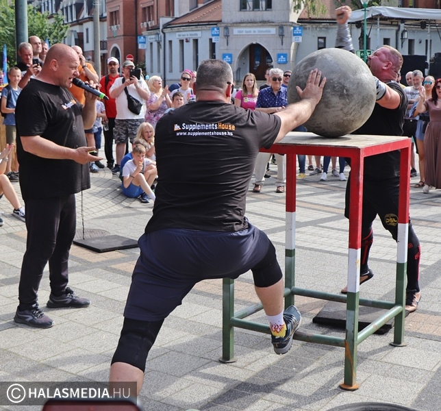 A főtér hőségkatlanjában aztán a rönknyomás következett, amely 90,110, illetve 130 kilogrammos próbatételt jelentett. Mindezt a fej fölé kellett emelni, a lehetőség szerint minél több alkalommal. Locskai Józsi ebben a számban is szépen teljesített, a forróság pedig extra terhet jelentett mindenki számára. A végére maradt a kőgolyó pakolás, van, aki a 130 kilogrammos, civil számára megfoghatatlan, és emelhetetlen eszközt választotta, a bátrabban pedig a 150 kilogrammost. A mi Józsink biztonságra ment, ez azt jelentette, hogy ő lett a legerősebb ember a kiskunhalasi versenyen.