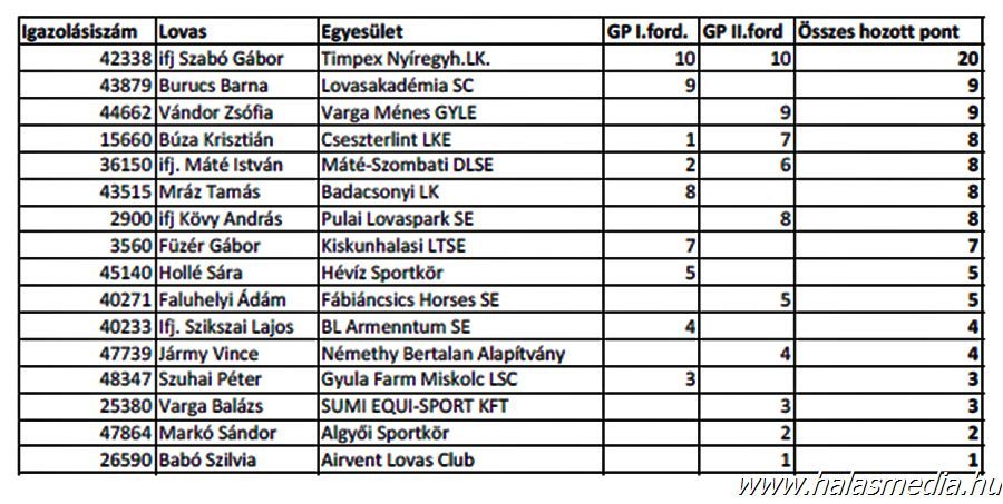 A felnőtt kategóriában az abszolút GP győzelemre a legnagyobb esélye ifj. Szabó Gábornak, a Timpex Nyíregyháza LK sportolójának van, aki magasan vezeti a pontversenyt. Helyi lovas is érdekelt a felnőtt GP sorozatban, mert a Kiskunhalasi LTSE lovasa, Füzér Gábor a középmezőnyben szerepel.