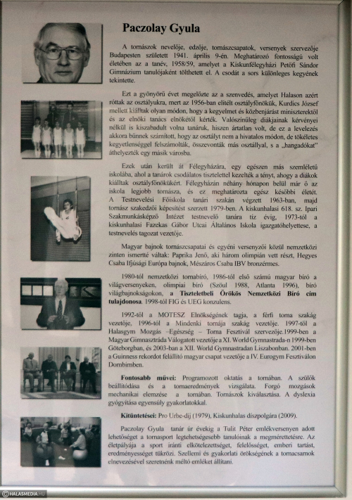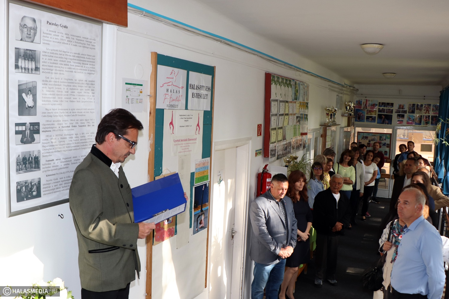 A jeles alkalomból egy kis kiállítást is meg lehetett tekinteni egykori fotókból, újságkivágásokból. Az ünnepségen részt vettek a családtagok is. Fülöp Róbert polgármester és Kárász Péter igazgató méltatta Paczolay Gyulát, aki sokat tett a halasi tornáért, a városért. Az intézményvezető azt is kiemelte, hogy több tanítványa jelenleg is az iskolában pedagógus és edző. Az intézmény énekkarának rövid műsora után az edzőteremben fitnesz és tornászbemutatót tekinthettek meg a vendégek. A folyosón lévő emlékfalnál hangzott el Mészáros Csaba verse. Az edzőteremben több kiváló tehetség bontogatta az elmúlt évtizedben szárnyait, a magyar férfi tornászválogatott itt edzőtáborozott a szöuli olimpiai előtt. Manapság is népszerű a tornászok és a fitneszesen körében.