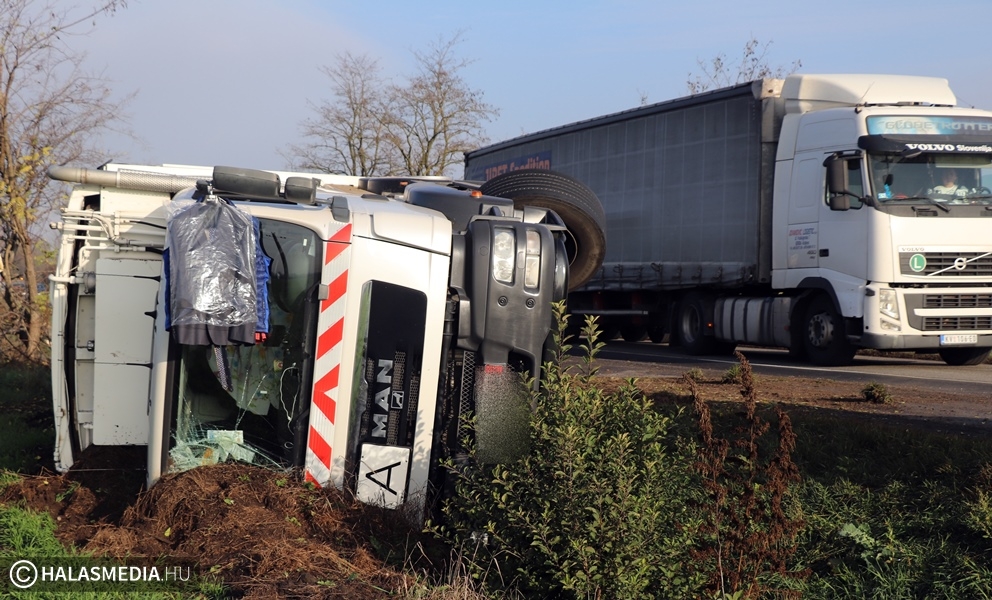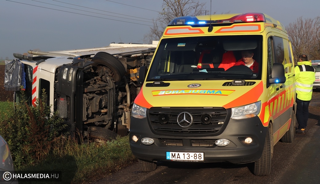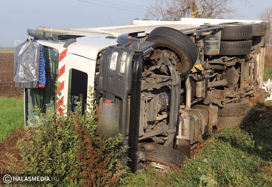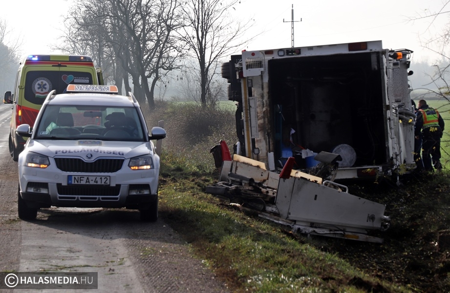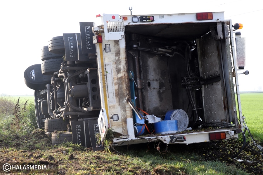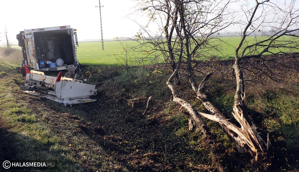 Egy német rendszámú kukásautó haladt csütörtökön reggel az országhatár felé, az 53-as főúton. Kisszállás közelében, eddig tisztázatlan körülmények miatt, a jármű az árokba hajtott, nekiment egy fának, majd oldalára borult.