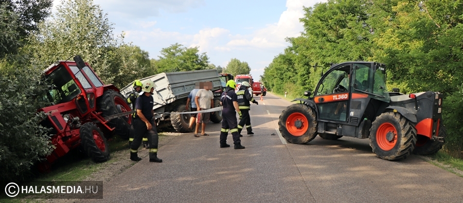 Balesethez riasztották a halasi tűzoltókat szerdán délután, nem sokkal fél öt után, Mint megtudtuk, egy traktor vontatott egy búzával megrakott pótkocsit, a Kunfehértóra vezető úton, az ötös kilométerszelvényében árokba csúszott. A vontató egyik hátsó kereke a levegőben volt, a vontatmány alatt viszont megsüllyedt a felázott útpadka. Szerencsére a gép nem borult fel, viszont a műszaki mentése nem volt egyszerű feladat. Teljes útzárat rendeltek el, amely közel egy órán át tartott.