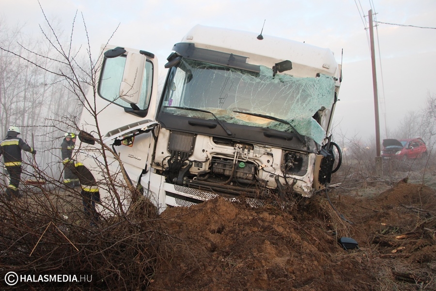 Tömegbaleset történt pénteken reggel, háromnegyed hét körül az 53-as főúton, Kiskunhalas és Pirtó között. Egy szerb rendszámú kamion ismeretlen okból áttért a szemközti sávba, ahol egy busszal ütközött, majd elsodortak egy Citroen Picassot is. A törmelékek több autóban is kárt okoztak. A helyszínre nagy erőkkel érkeztek a mentők, tűzoltók és a rendőrség is. Csodával határos, hogy a balesetnek „csak” három sérültje volt.