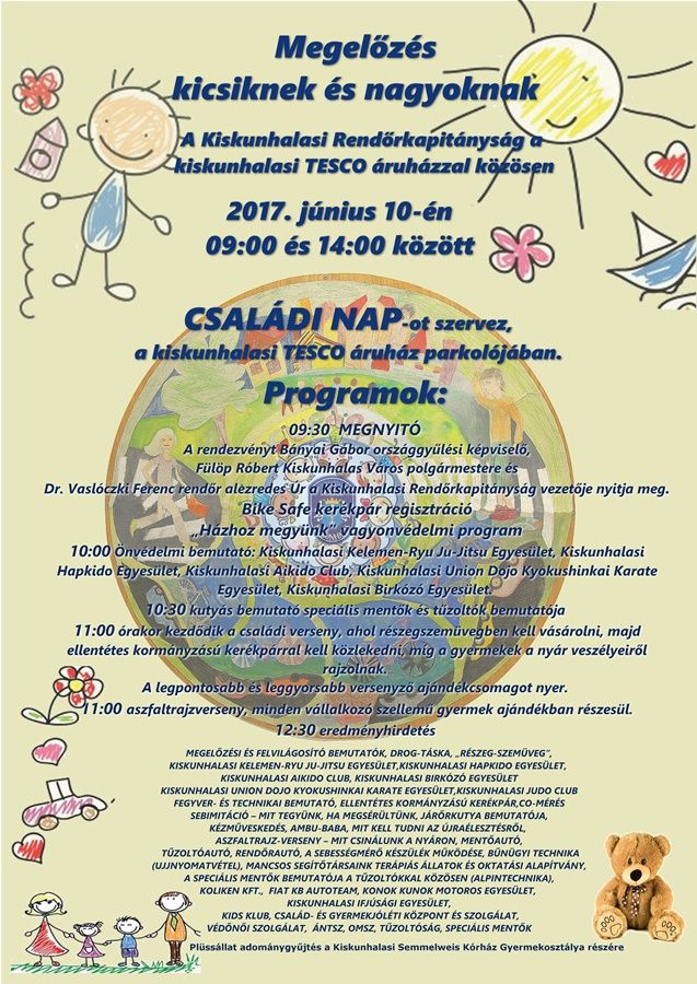 Bűnmegelőzési szempontból kiemelt figyelmet kap a nyári vakáció előtti időszak. A Kiskunhalasi Rendőrkapitányság ezért szervezi éppen ekkor a hagyományos Családi Napját. A Tesco parkolójában szombaton 9-14 óra között rengeteg látnivaló lesz. Nemcsak hasznos tanácsokkal látják el a diákokat és szüleiket, hanem lehet játszani is, be lehet ülni a rendőr-, tűzoltó- és mentőautókba, és szerveznek családi vetélkedőt is. Természetesen nem maradhat el a hagyományos tűzoltó- és speciális mentő bemutató sem. Az alábbi plakáton találhatják a részleteket.