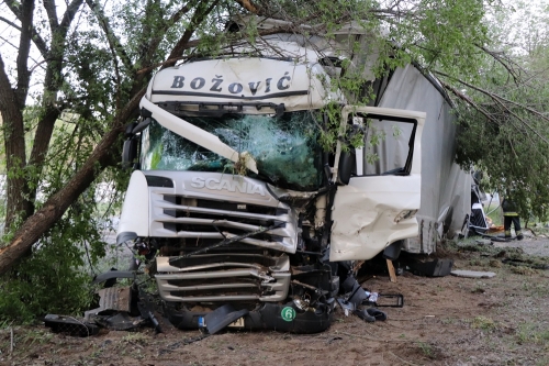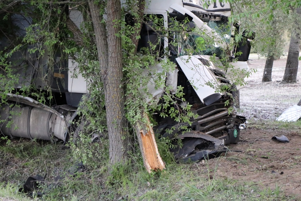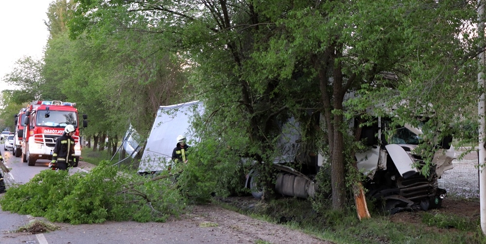 Óriási szerencse kellett ahhoz, hogy ne legyenek sokkal súlyosabb következményei annak a balesetnek, amely szerdán késő délután történt Kiskunhalas és Pirtó között, az 53-as főúton. Egy szerb rendszámú kamion közlekedett Pirtó irányába, amikor 47-es kilométerszelvényben a bal első kereke durrdefektet kapott. A sofőr elvesztette uralmát a jármű fölött. Áttért a bal oldalra, szerencsére senki sem jött akkor, éppen ott, letért az útról, fát, egy közlekedési táblát is kitört, majd a kerékpárútnál megállt.