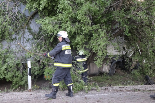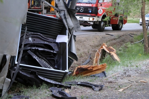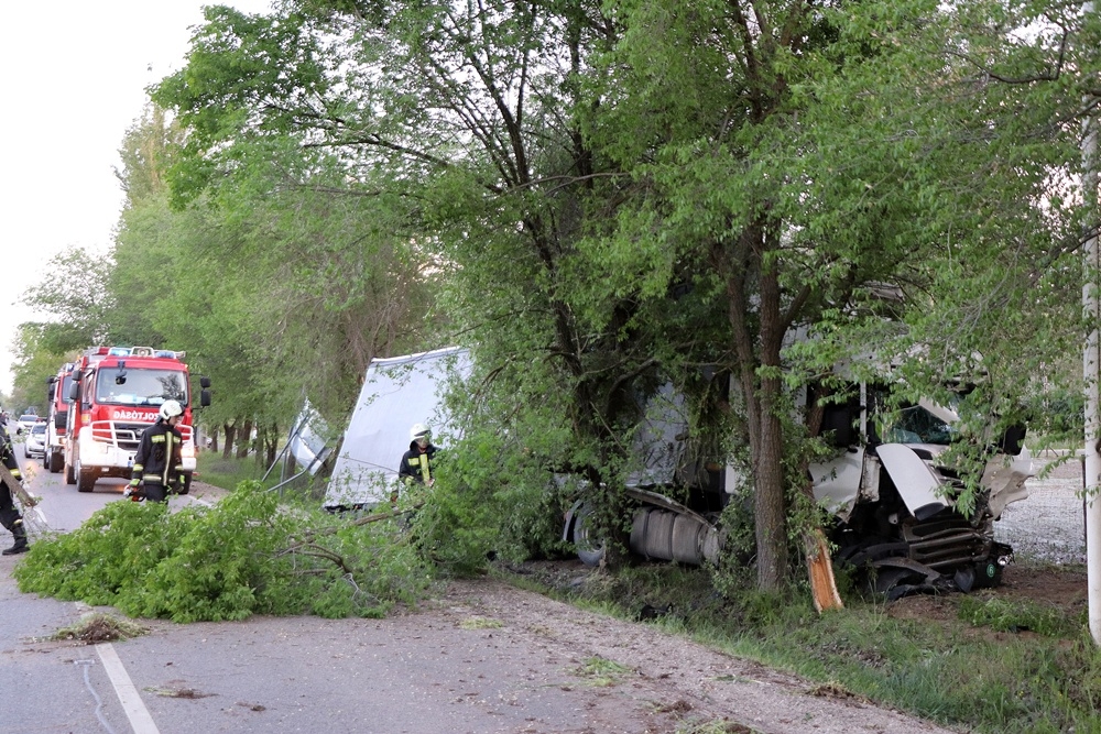 A szemtanúk azonnal tárcsázták a 112-es segélyhívót, a kiskunhalasi tűzoltók három autóval érkeztek a helyszínre. A kamion sofőrjének a lába a pedálok közé szorult, ezért feszítőhenger kellett ahhoz, hogy kiszabadítsák. Elsődleges adatok szerint könnyebben sérült, helyszíni ellátást követően mentő a Semmelweis Kórház baleseti ambulanciájára szállította. A kiérkező egységek még áramtalanították a járművet, majd fűrészek segítségével a faágakat levágva lehetővé tették a későbbi műszaki mentést. A kamion rakománya is megsérült, a jármű totálkáros lett. A munkálatok teljes útzár mellett zajlottak.