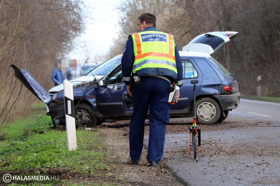 Egyelőre ismeretlen okból tért le az útról egy Renault Clio, amely Kunfehértó irányából haladt Kiskunhalas felé. Az autó egy fának is nekütközött, alaposan összetört. A sofőr elsődleges adatok szerint megsérült, őt a mentők a Senmelweis Kórház sürgősségi baleseti ambulanciájára szállították. A helyszínre riasztották a halasi tűzoltókat, akik áramtalanították a járművet és részt vettek a műszaki mentésben, valamint a forgalomirányításban is. A helyszínelés idejére félpályás, időszakosan pedig teljes útzár volt. A baleset pontos körülményeit a Kiskunhalasi Rendőrkapitányság közlekedésrendészete vizsgáljaú
