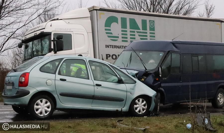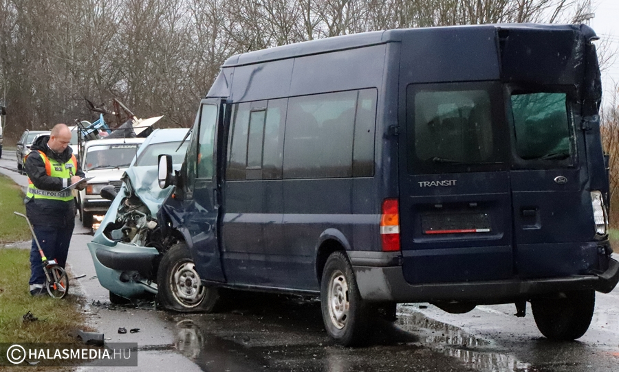 Hat sérültje volt annak a balesetnek, amely kedden, nem sokkal délután negyed kettőkor történt Kiskunhalas közelében, az 53-as főúton. Eddig annyit lehet tudni, hogy egy lengyel kamion haladt Balotaszállás felé, amikor előzni kezdte egy szerb rendszámú kisbusz. Eddig tisztázatlan körülmények között a nagyobb jármű hátulról nekiment a Ford Tranzitnak, amely átsodródott a másik oldalra és frontálisan ütközött a szemből érkező Citroen Picassoval. A helyszínre a mentők és a rendőrök mellett a halasi tűzoltókat is riasztották. A helyszínelés és a műszaki mentés idején teljes útzár volt, amelyet délután 4 órakor oldottak fel.