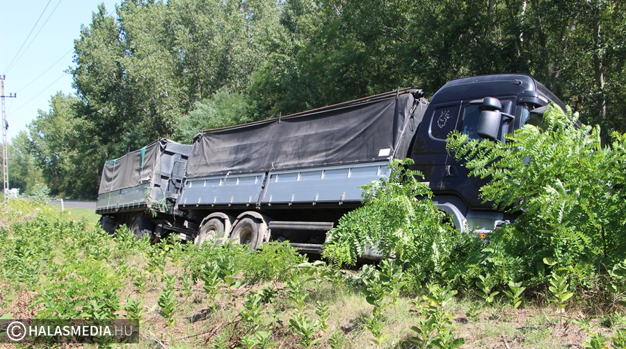 A sofőr munkatársunknak azt mondta a helyszínen, hogy Soltról tartott Mélykútra, közel tíz tonnányi petrezselyemmel, amikor Balotaszállás után egy szemből érkező, külföldi rendszámú kamion átjött a sávjába, így neki le kellett húzódnia az útról. A mély homok miatt irányíthatatlanná vált a jármű, a nyergesvontató majdnem az oldalára dőlt. . A rakomány egy része az aszfaltra ömlött. A műszaki mentésig félpályás útzár van érvényben, rendőrség irányítja a forgalmat. A helyszínre hamarosan kamionmentő érkezik, amely már elindult Kecskemétről.