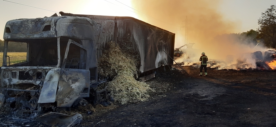 Vasárnap délután riasztották a kiskunhaalsi tűzoltókat, hogy Zsana külterületén kigyulladt egy kamion, annak pótkocsija, valamint nyolcvan körbála. Mire az első egység a helyszínre érkezett, a jármű már teljes terjedelmében égett. A kánikulai hőségben hosszú órákon át tartott az oltás, valamint az utómunka. A hivatásosok munkáját a kiskunhalasi önkéntes tűzoltók mellett egy erőgép segítette.