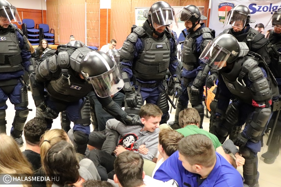 Önként jelentkező diákok vállalták a demonstrálók szerepét. A készenléti rendőrök ugyan viselték a speciális védőruhát, de nem alkalmaztak kényszerítőeszközöket és azokat a fogásokat sem, amelyeket egyébként éles helyzetben használnak. A látványos bemutató végén a dékánisok megtapsolták az egyenruhásokat. - Igyekeztünk bevonni a résztvevőket, hogy testközelből érzékeljék, milyen is egy intézkedés. Úgy láttam, a fiatalok fogékonyak és igen aktívak voltak- mondta Béres István alezredes, osztályvezető-helyettes.