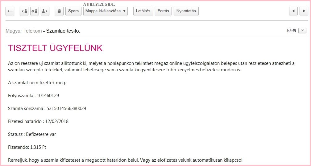 Ezzel a mondattal kezdődik az a levél, amit több halasi internetelőfizető is megkapott az elmúlt néhány napban. Mindannyiuk e-mailjében ugyanaz a szöveg volt olvasható. A „cég" egy be nem fizetett számlára hivatkozva kér párezer forintos összeget, amit a leírás szerint egy linkre kattintva egyenlíthet ki a felhasználó.