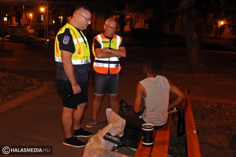Egy rövid pihenőt követően, a járőrözés második részében a csapat kettévált: hárman gyalogosan, a többiek rollerekkel folytatták a szolgálatot. A halasi főtér teljesen kihalt volt. Vera, a városban kétes ismertségnek örvendő hajléktalan egy padon aludt, őt is felkeltették. Egy üveg bor maradt utána, egyébként ő is a mezítlábas sétát választotta ezen az estén. Néhány autós próbálta meg azt, hogy milyen hangos, és gyors az autója a belvárosban. A sötétben világító jelvények, valamint egy zseblámpavillantás elég volt ahhoz, hogy elmenjenek onnan. Egyébként egy páros ellenőrizte a bevásárlóközpont parkolóit is, de ezúttal üresek voltak.