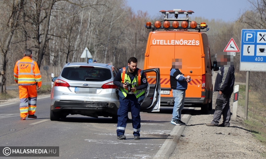 Baleset történt vasárnap, háromnegyed egy körül az 53-as főút, 51-es kilométerszelvénylben, Kiskunhalas közelében. - Szemből jött egy szirénázó mentőautó, az előttem haladók is igyekeztek lehúzódni. Mikor észrevettem az előttem lévő Fordot, fékeztem, de nekiütköztem a hátuljának. Az autóm megpördült, az árokba csapódtunk. A ruzsai vásárból igyekeztünk hazafelé a sógorommal - mondta annak az Opelnek a sofőrje, aki figyelmetlenségével a baleset okozója volt. A vezető elismerte a felelősségét. Utasát kivizsgálásra a kiskunhalasi Semmelweis Kórház sürgősségi osztályára szállították. A két járműben összesen hatan utaztak. A karambolhoz riasztották a halasi tűzoltókat, akik az Opelt áramtalanították. A helyszínelés idején félpályás útzár volt, rendőrök irányították a forgalmat.