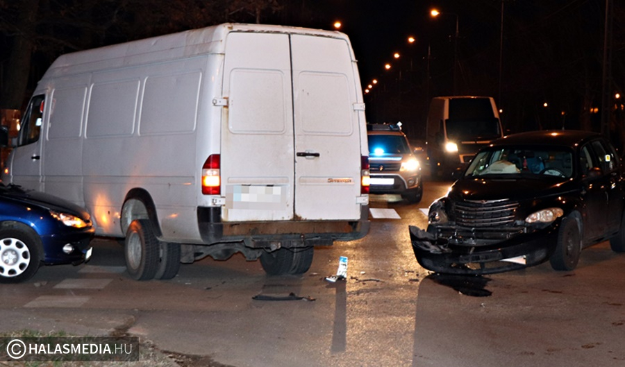 Három autó volt az érintettje annak a balesetnek, amely kedden este negyed hét körül történt a Bajza utca és az 53-as főút kereszteződésében. Egy Mercedes Sprinter sofőrje figyelmetlenül kanyarodott balra, e miatt előbb egy Chryslerrel ütközött, majd egy Peugeotnak is nekiment. Az egyik sofőrt, egy kismamát kivizsgálásra a halasi kórházba szállították a mentők.