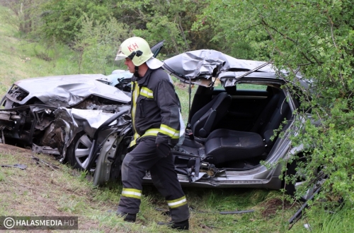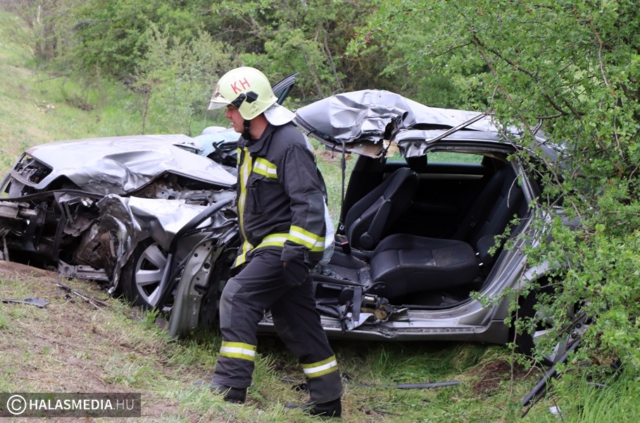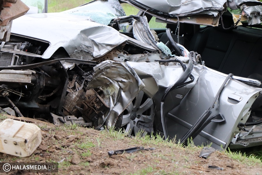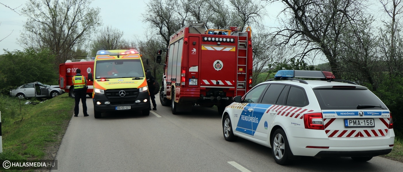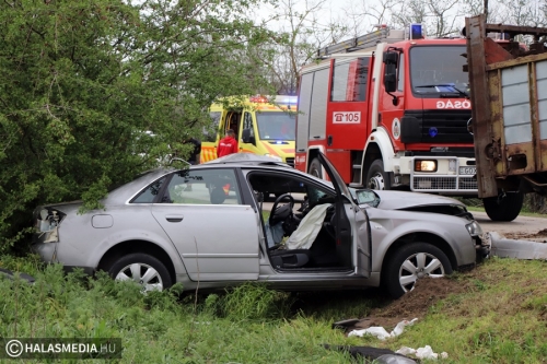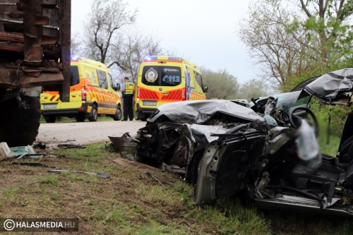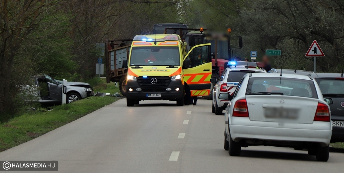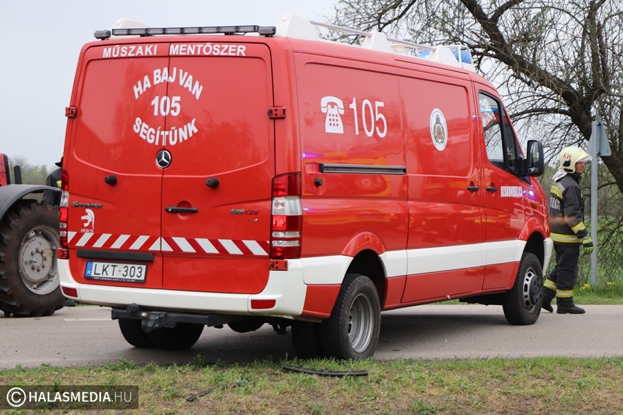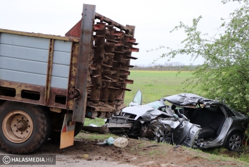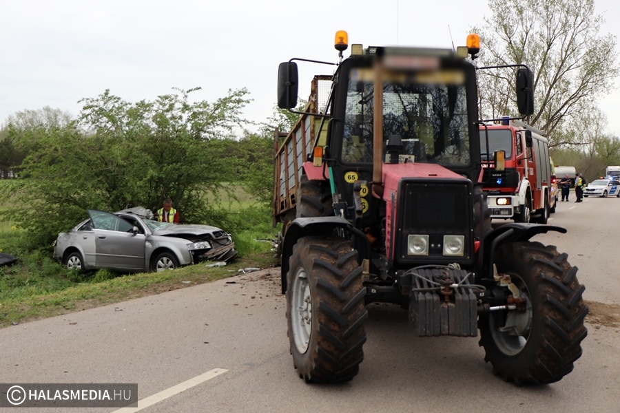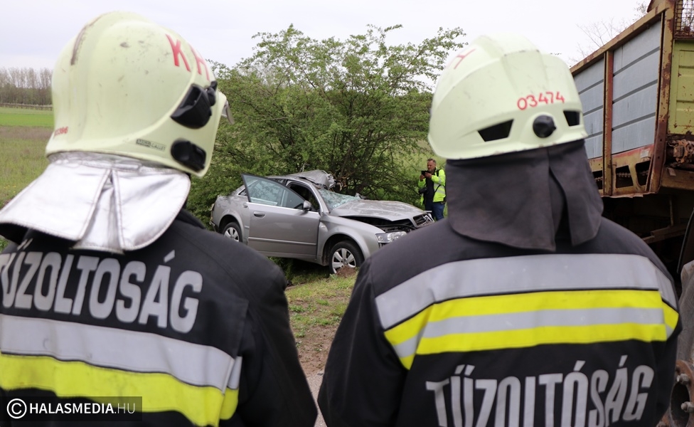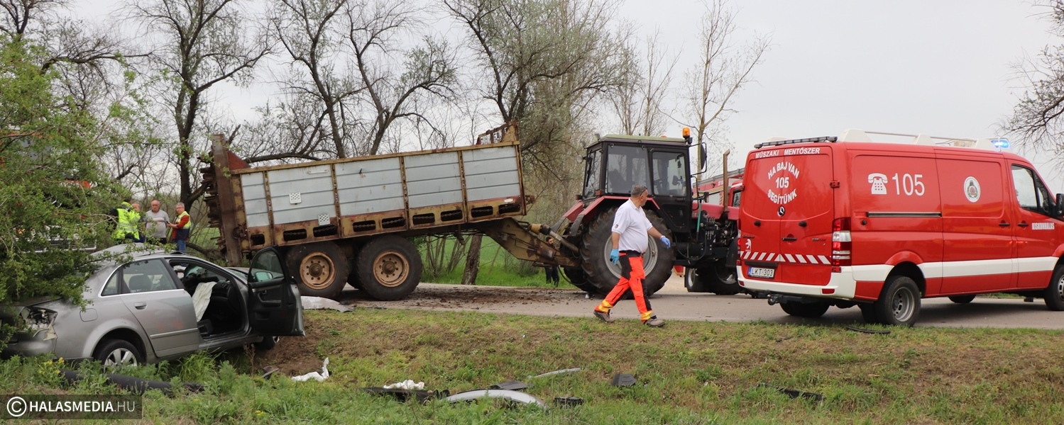 Balra kanyarodó traktor trágyaszóró pótkocsijának ütközött egy Audi csütörtökön délután Kiskunhalas és Kiskunmajsa között, Tajó közelében. A szerencsétlenül járt autó az árokba csapódott. Egy szemtanú azonnal telefonált a 112-es segélyhívóra, a kiskunhalasi, kiskumajsai mentők, mellett több tűzoltóegység is a helyszínre érkezett. Szükség volt rájuk, mert a sofőr a roncsba szorult, súlyos sérüléseket szenvedett. Miután kiszabadították őt, a mentők stabilizálták az állapotát, majd a kiskunhalasi Semmelweis Kórházba szállították. Az Audiban ketten ültek, a jobb egyben utazó férfi, elsődleges adatok szerint, könnyebb sérülésekkel megúszta a balesetet. A műszaki mentés és a helyszínelés idején teljes, majd félpályás útzár volt. A karambol körülményeit a Kiskőrösi Rendőrkapitányság vizsgálja.