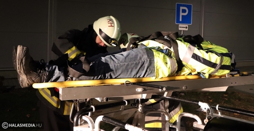 Őt a helyszínre riasztott kiskunhalasi és kiskunmajsai tűzoltóknak kellett lehozni, emelőkosaras létra, speciális hordágy segítségével. Ezzel párhuzamosan zajlott a feltételezett tűz oltása is. A gyakorlat forgatókönyve szerint a raktár területén, amely füsttel telítődött, egy targoncásra ráborult a saját járműve. Az ő mentése is speciális eszközökkel történt meg. A próbaridók során a Merkbau dolgozói példásan együttműködtek a tűzoltósággal.
