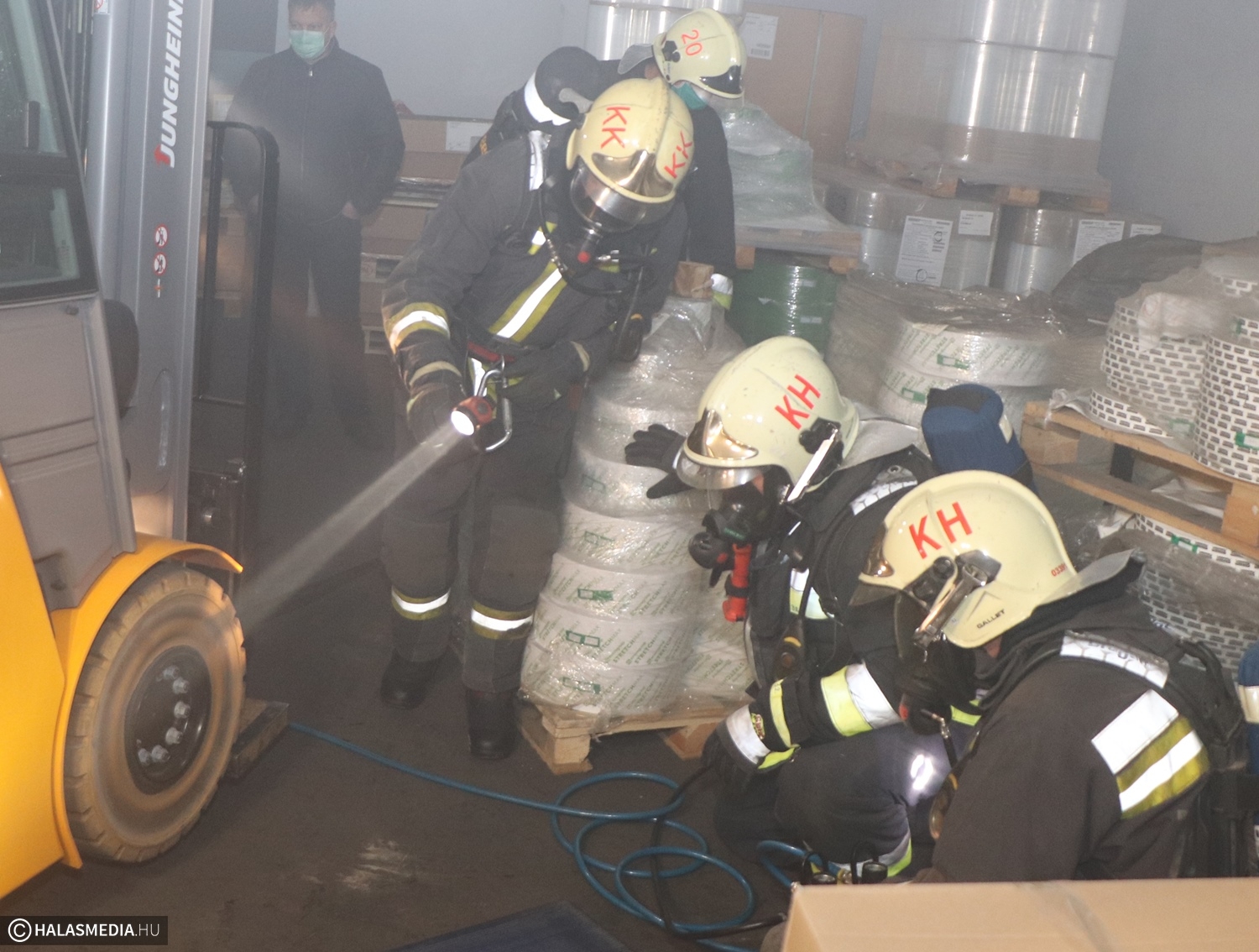 A Halaspack egyik csarnokában tűz keletkezett, ráadásul egy dolgozót baleset ért és egy targonca alá szorult. A kiskunhalasi és kiskunmajsai tűzoltók gyakorlatának forgakókönyvében szerepelt ez. A jókora létesítményt kellőképpen befüstölték, hogy élethű legyen minden.